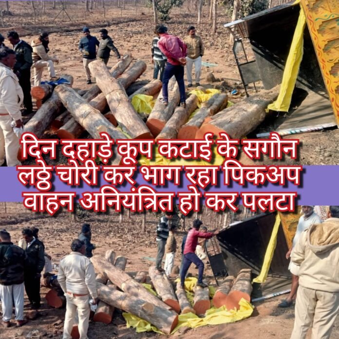 दिन दहाड़े कूप कटाई के सगौन लठ्ठे चोरी कर भाग रहा पिकअप वाहन अनियंत्रित हो कर पलटा
